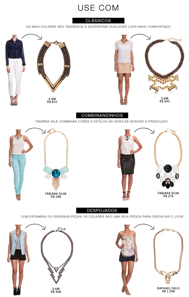 Aqui vão dicas para aquelas que ficam na dúvida na hora de compor looks com maxi colares. Se não for muito de cor, opte pelos mais neutros como esse primeiro, em formato de V, que é meu favorito. Tenho e uso com camisas, camisetas básicas com decote V e até mesmo com body ou frente única bem decotada. O importante é estar segura e não exagerar na mistura de cores e estampas para não errar (já para as mais ousadas, nada de limite). Algumas dicas :
