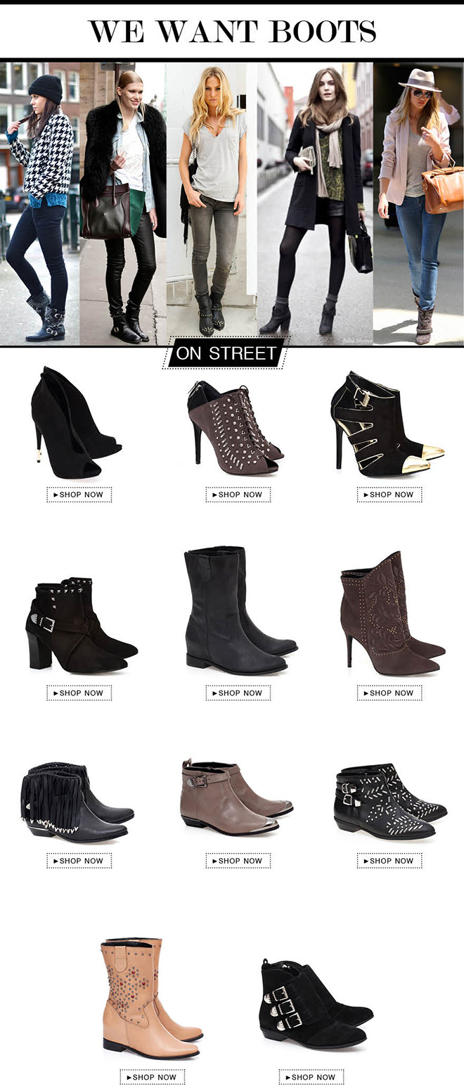 As botas western se apresentaram esse ano muito mais estilosas com tachas, spikes, bordados e fivelas. Encontradas em diversas alturas de saltos e canos, esse modelo conhecido como cowboy, fica lindo no estilo boho-chic usado com vestidos soltos e femininos,como já mostramos por aqui.