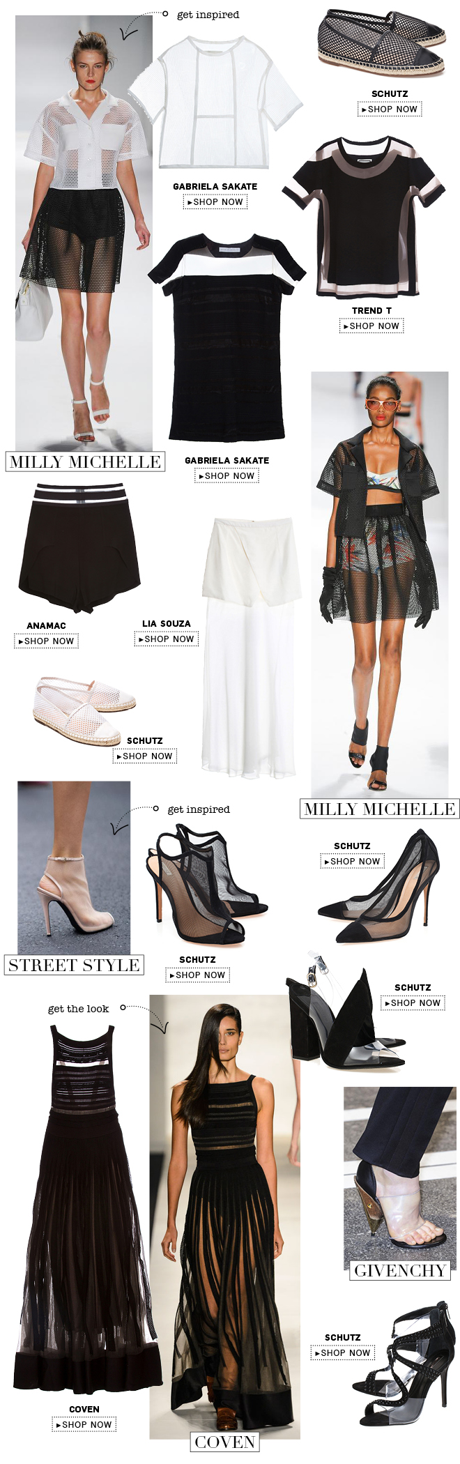 O encanto da tendência está em peças como blusas, calças, vestidos, saias e também nos sapatos. Opções não faltam! Com bom gosto e cuidado para não pecar no exagero, a transparência promete causar suspiros nos dias mais quentes.
