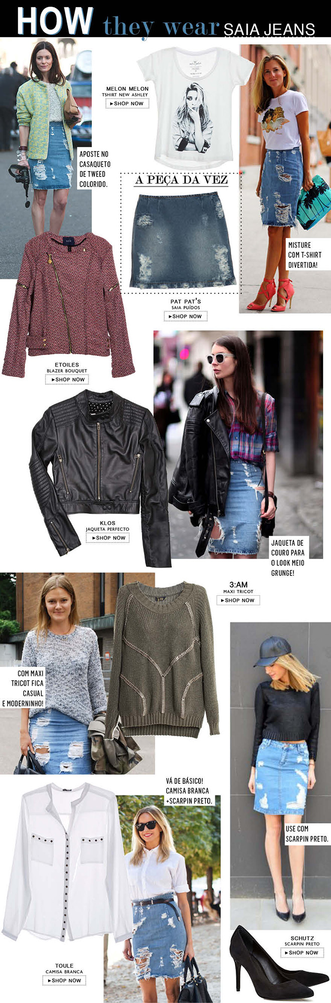 A democracia do jeans, aliada à feminilidade da saia, criou um dos maiores curingas do nosso closet. Entre idas e vindas no radar fashion, a saia jeans fez seu retorno triunfal nesta temporada. Febre entre as antenadas, o modelo do momento é desfiado, com pegada urbana e detonada. Para revivê-la de um jeito atual, confira alguns truques de styling que adoramos: