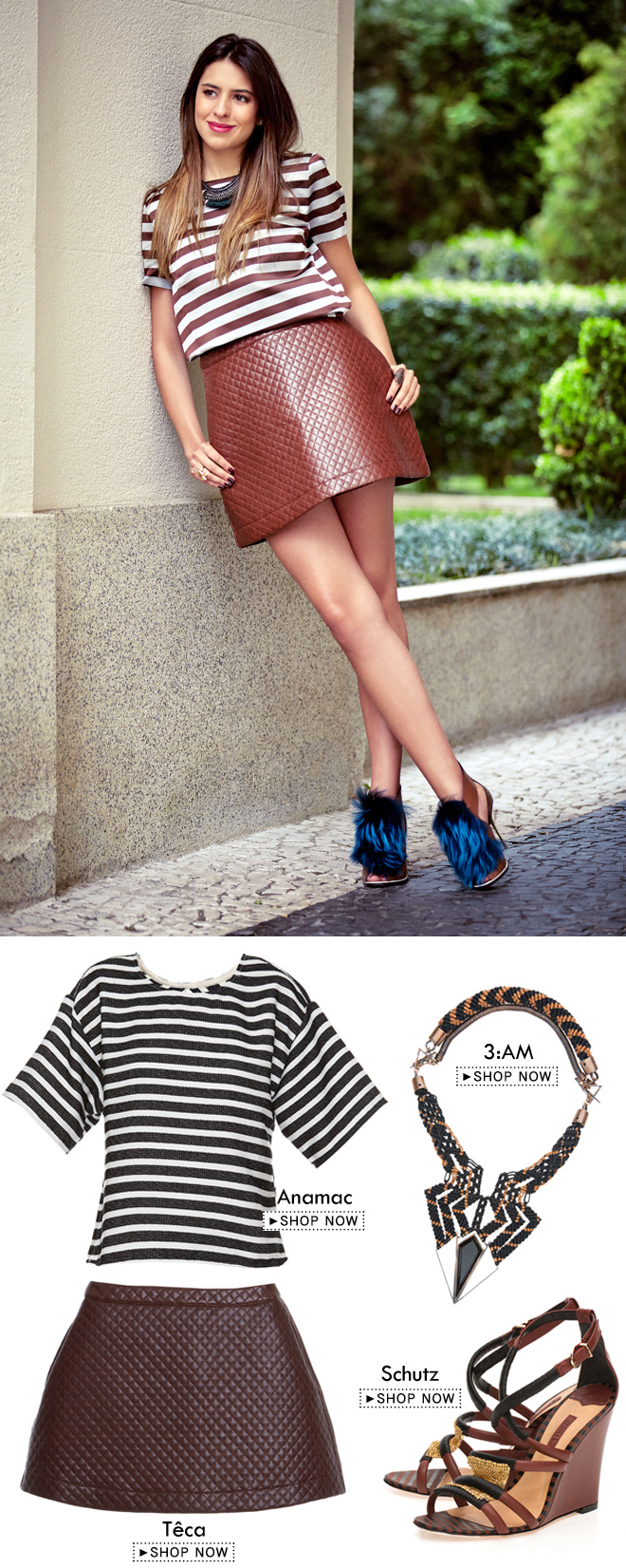 Amanda mostrou uma maneira de usar a saia da Teca. Optou por uma cropped listrada que fica distante do corpo e um sapato poderoso. A saia, que possui formato e tecido chamativos, pede poucas peças na hora do look. Seja com t-shirt de malha, cropped ou moletom, fica um arraso com qualquer tipo de sapato: alto ou baixo. Este é tipo de roupa ideal para aquelas que buscam algo neutro para compor com o restante do armário. O marrom não tem erro, mas se tiver medo de misturar, confira a mesma peça na cor preta. Gostaram?