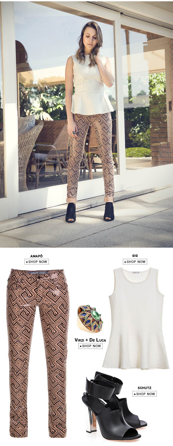 As prints geométricas sugerem looks com pegada clean e futurista! E foi seguindo essa regra que a blogger Ivi do Style Update compôs essa produção. O top peplum e o sapato fechado finalizam a calça estampada da Amapô com sucesso! Não ficou incrível?