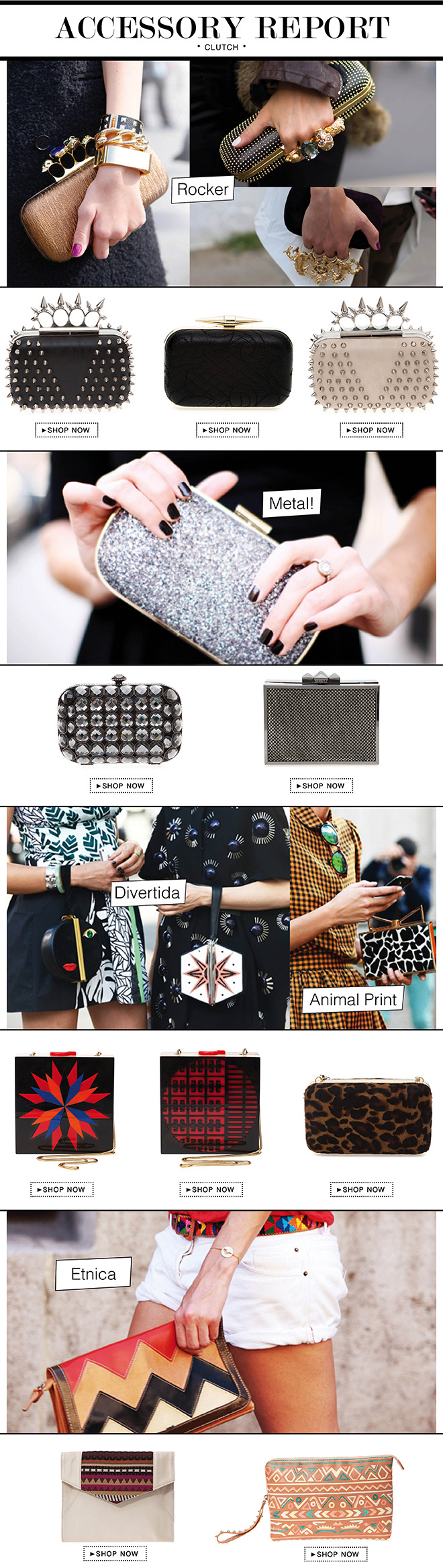 Por muito tempo elas foram vistas como acessórios para festas e looks noturnos, mas atualmente as clutches se mostram presentes na luz do dia como ninguém! Pequenas, mas não menos importantes, o universo das clutches vive sendo reinventado, trazendo diversas versões! Animal print, rocker, metálica, étnica… tem para todos os gostos. Mas não esqueça de escolher apenas os itens indispensáveis para colocar dentro dela. Confira nossa seleção!