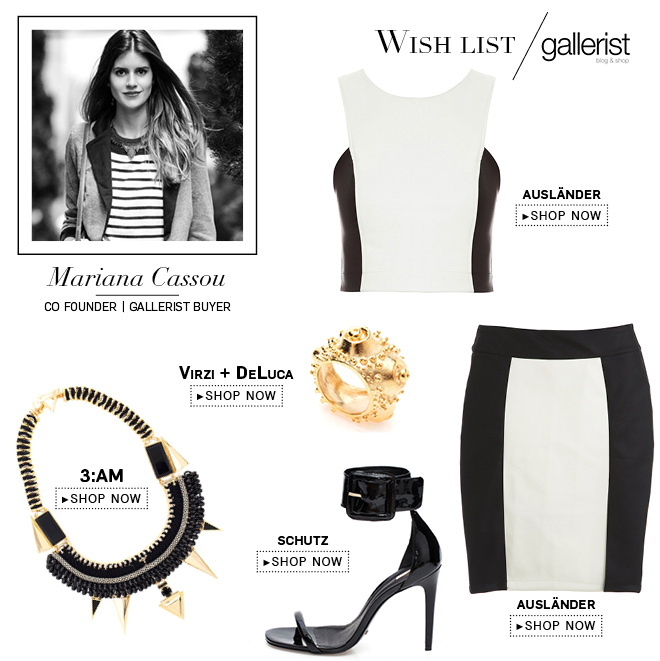 Na minha Wishlist da semana escolhi o conjunto de saia lápis e cropped bicolor da Auslander. Para dar um toque à produção, acessórios com tons de dourado e preto. Vontade de sair assim hoje! Aprovado?