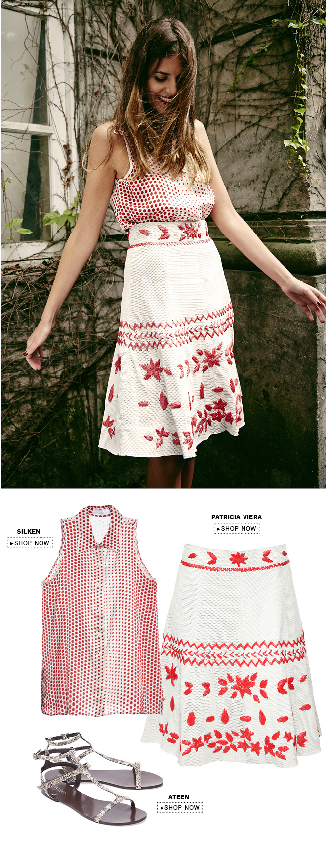 Se tem uma paixão no mundo na Moda, eu diria que a minha é por couro. Calças, saias, vestidos… Tudo em couro me encanta. E quanto mais primoroso e inusitado, melhor. E foi assim que eu me apaixonei pela saia da Patrícia Viera (sou fã dessa gênia). A saia é toda trabalhada com um bordado de ráfia, em cima de um couro texturizado. Combinei com regata de seda da Silken, e o resultado ficou divertido e fresco!