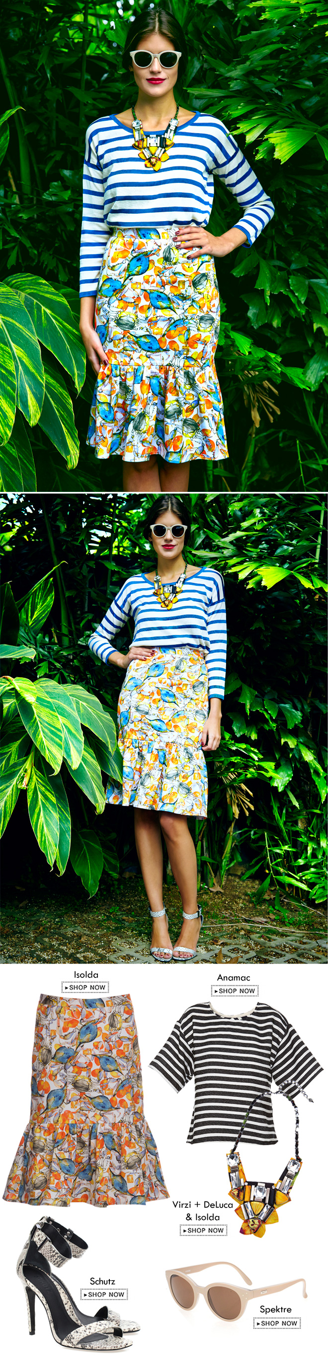 A tendência Tropical aponta ser uma das apostas mais fortes para esse Verão. Para isso, nada melhor do que eleger uma das estampas da Isolda para ficar por dentro dela! Uma forma de usar as estampas tropicais sem cair na mesmice é misturá-las com listras. Confira o resultado do look eleito pela Mari e Shop her style!