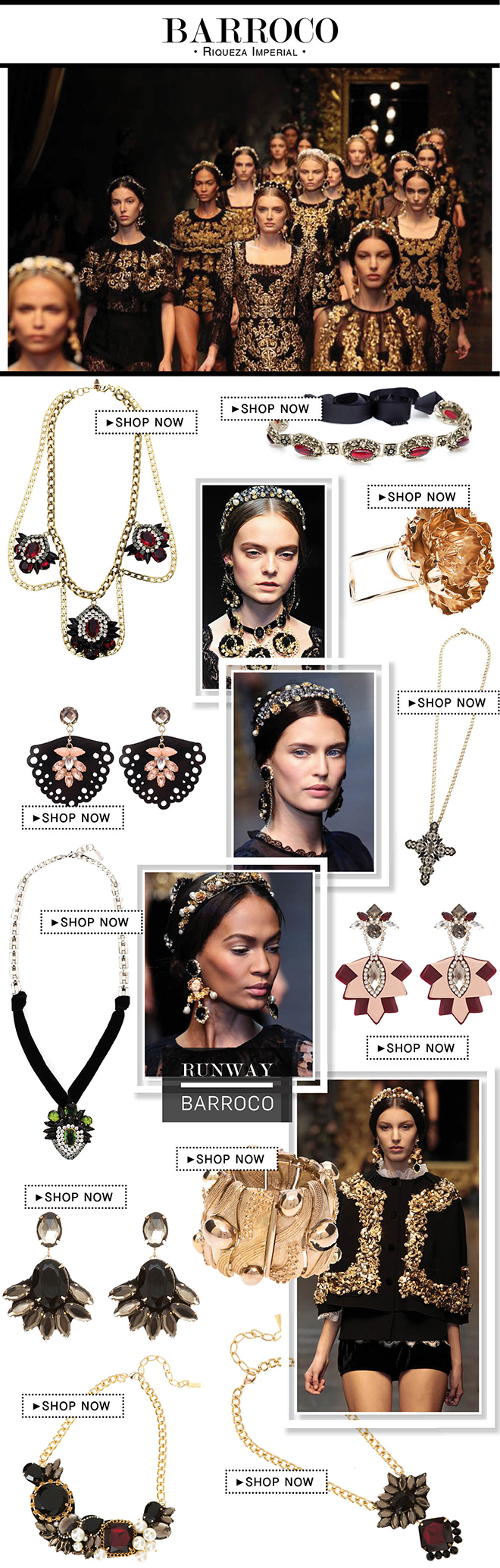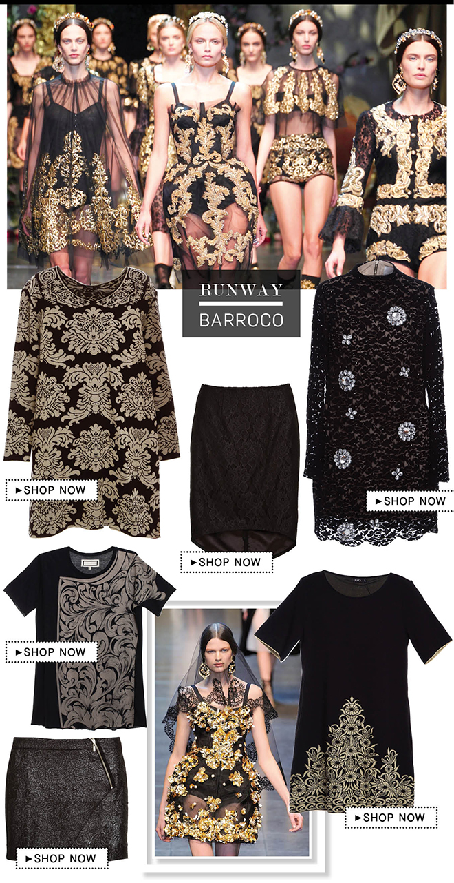 A passarela de inverno 2013 da dupla Stefano Dolce e Domenico Gabbana trouxe verdadeiras obras de arte barroca. Conhecido pela riqueza de ornamentos, este estilo não poupa bordados, aplicações, brocados e transparências. A inspiração vem da arte sacra e da pompa da realeza. Na vida real, o look barroco funciona com peças em renda, estampas de arabescos e tecidos texturizados. Quase sempre no duo infalível preto + dourado.