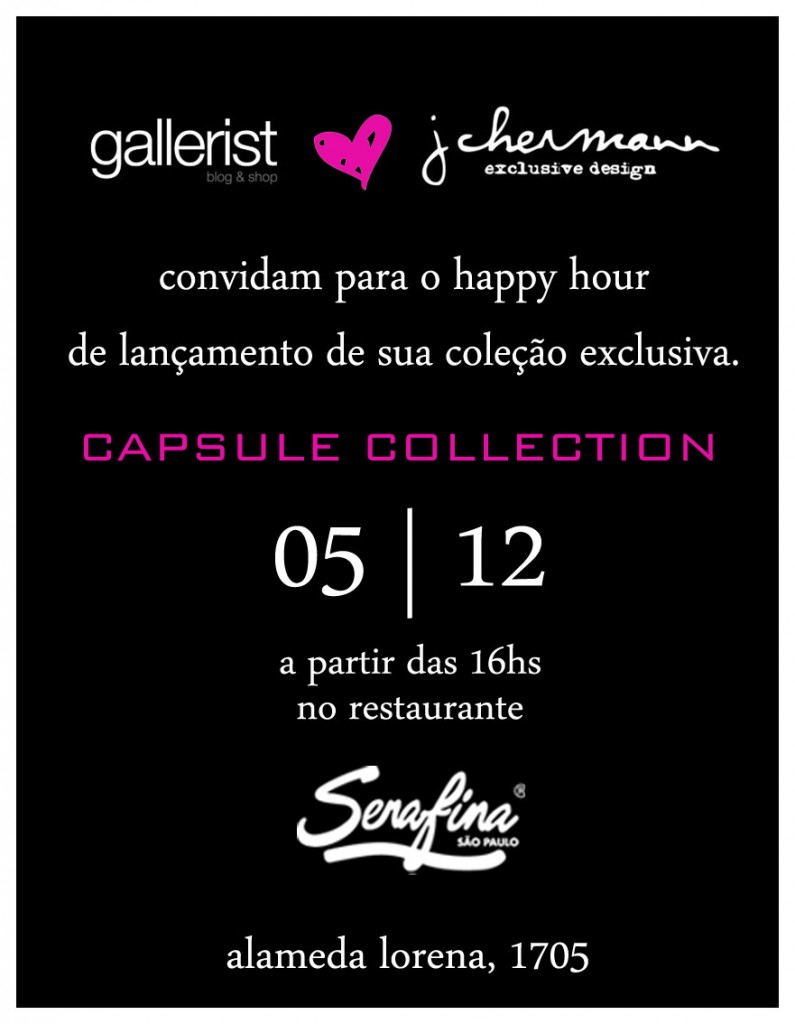 Convidamos vocês para o nosso happy hour de lançamento, hoje, no Serafina da Lorena. Venham tomar uns drinks conosco e conhecer a capsule collection que desenvolvemos em parceria com a J.Chermann.