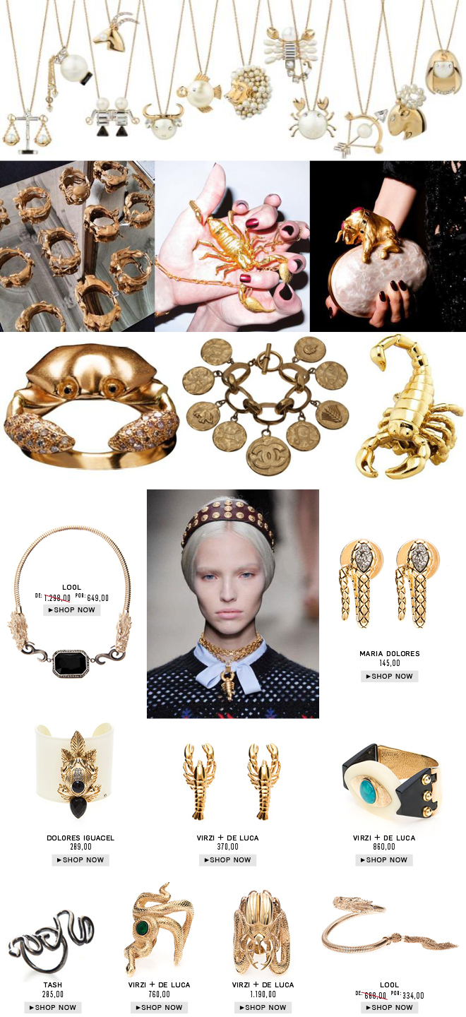 Quem trouxe a historia dos signos para a moda? Não sei… De repente Charlotte Olympia cria uma linha de clutches e sapatilhas de todos os elementos do zodíaco e faz o maior sucesso. Pena que o meu signo não foi privilegiado e recebeu um tom mostarda “meio passada” que não cai bem para o meu tom de pele… O que tenho certeza é que este tema está em pauta nas maiores joalherias do mundo, como Cartier, na linha da Dior, primeira foto abaixo e também nas grandes marcas, como vimos no desfile Couture S/S 2014 de Valentino. Nesta onda vale tudo, até o calendário chinês que segue data diferente e tem animais para cada ano (dragão, macaco, serpente…)