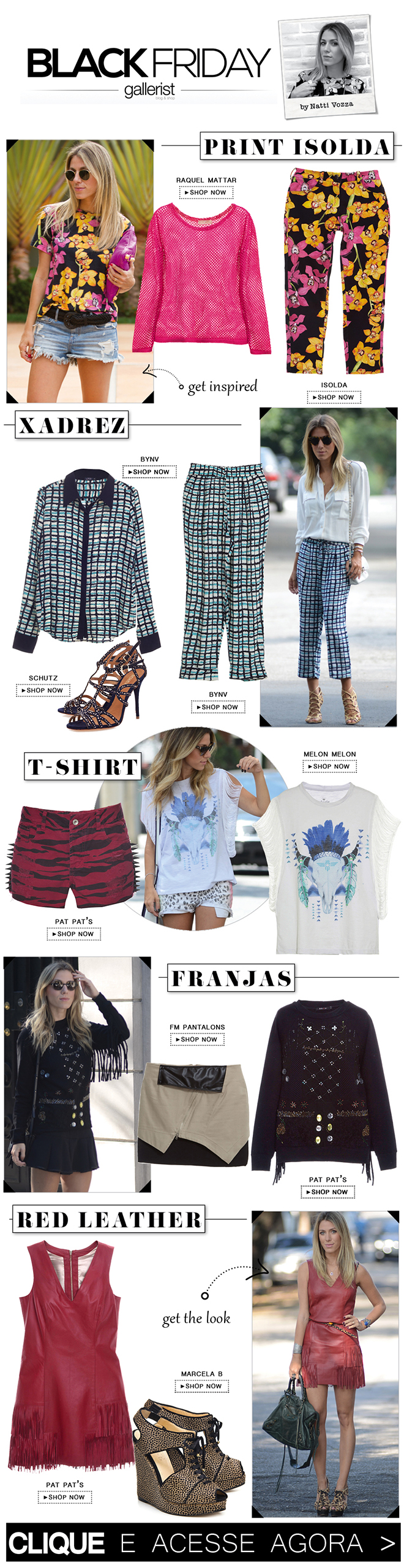 Nati Vozza também fez suas escolhas com os itens da nossa Black Friday. Ela apostou em estampas, couro e camisetas divertidas para abusar no Verão. Confira seus achados!